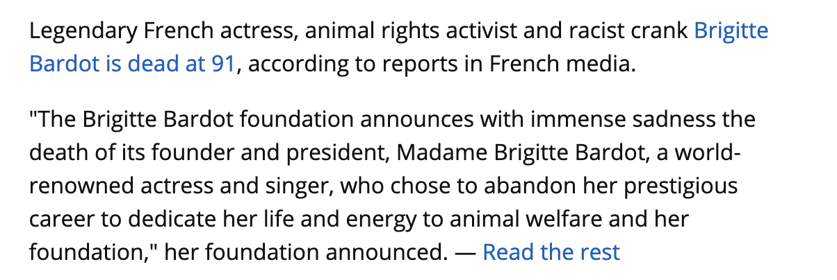 If I look at this article: https://boingboing.net/2025/12/28/famed-actress-brigitte-bardot-dead-at-91.html